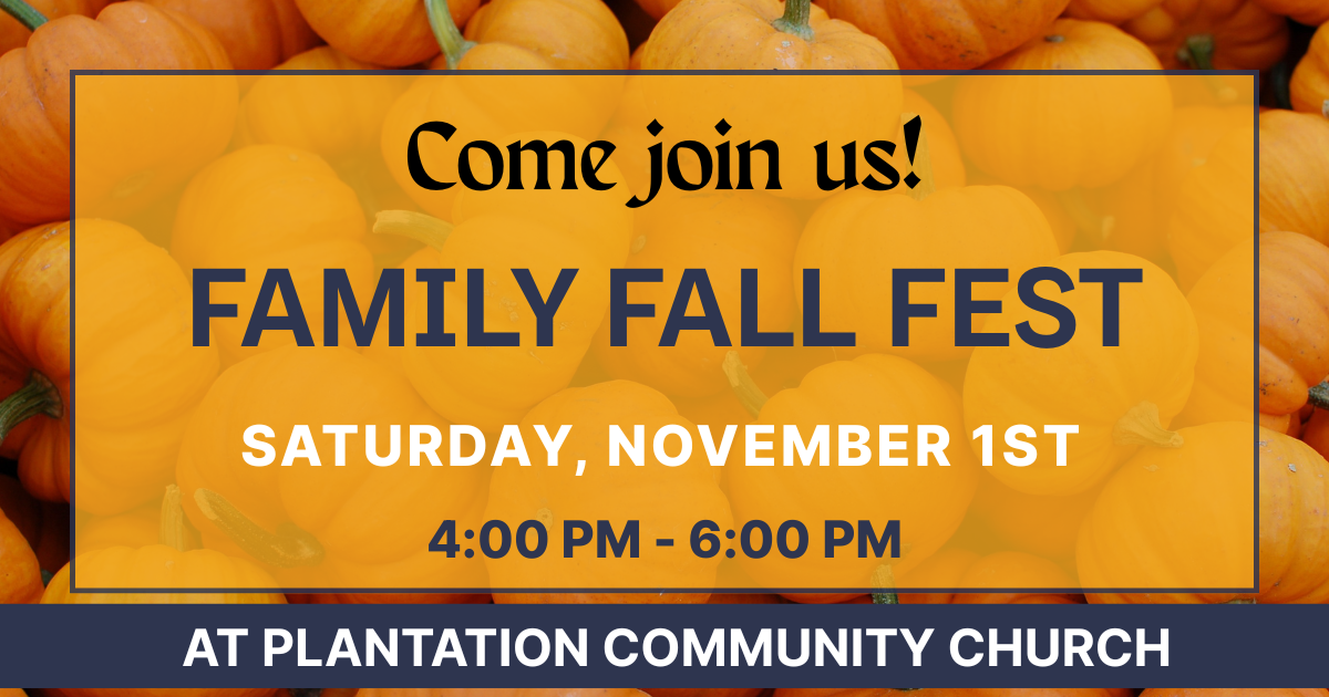 This November 1st, Plantation Community Church is inviting you and your family to a night of fun and festivities! There will be: Dunk Tank, Raffle, Rock Climbing Wall, Trunk or Treat, Candy, Food Trucks, Games, Photo Spot and more! For more information, please contact our church office.